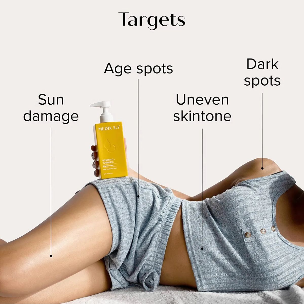 This lightweight, invigorating moisturizing body cream diminishes the look of dark spots, and uneven skin tones. Two forms of Vitamin C combined with Turmeric extract visibly brighten dull skin. Use daily to moisturize and reveal soft, radiant looking skin.