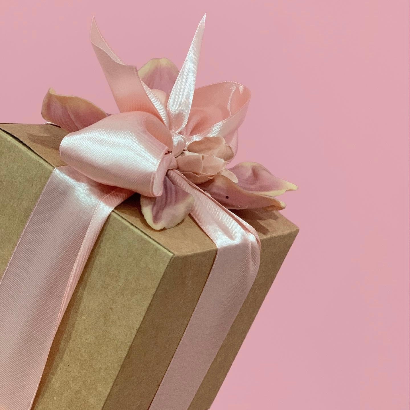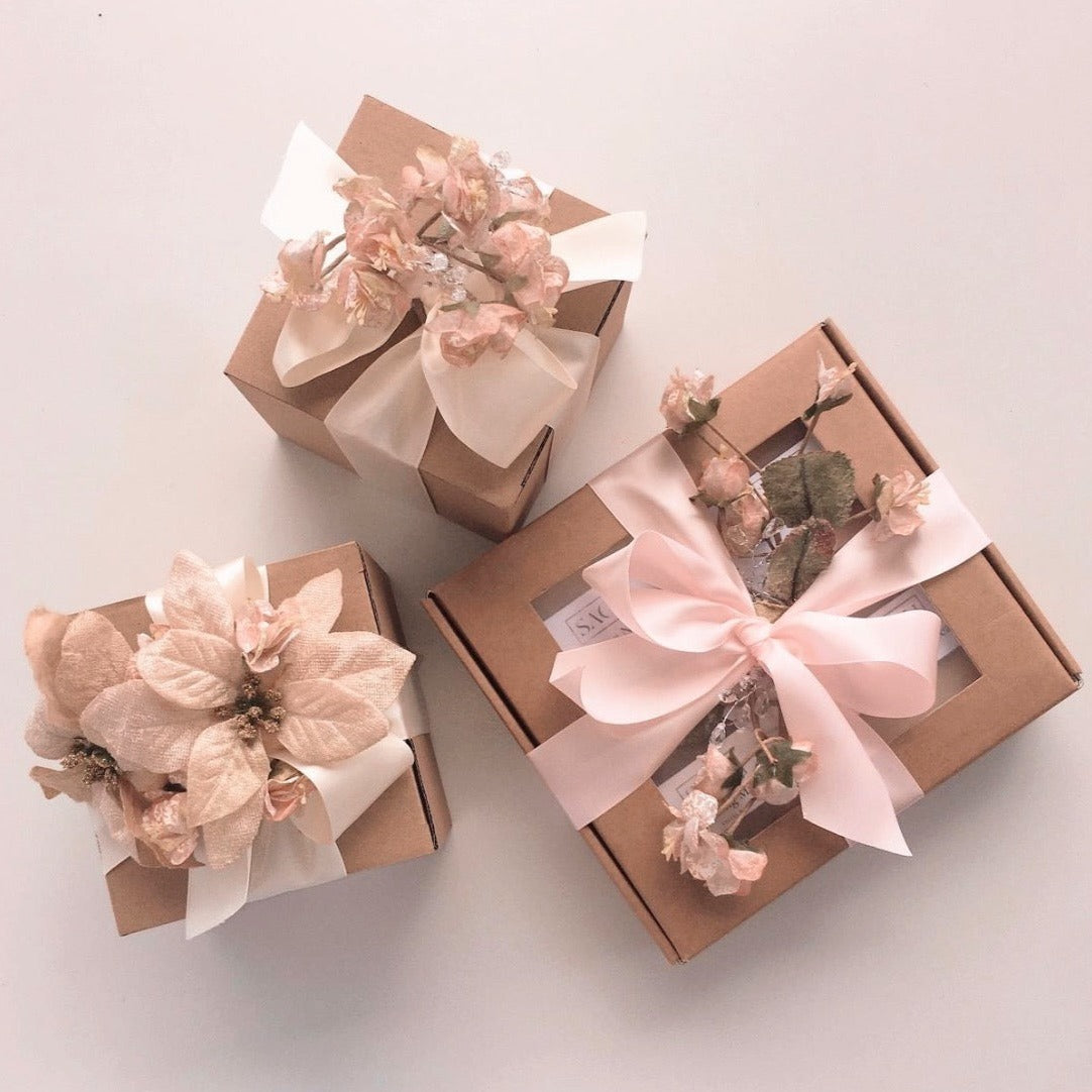 Our Classic gift boxes are beautiful kraft gift boxes wrapped with gorgeous ribbon and faux flowers following the SACH colour palette of nudes, blushes & pastels.