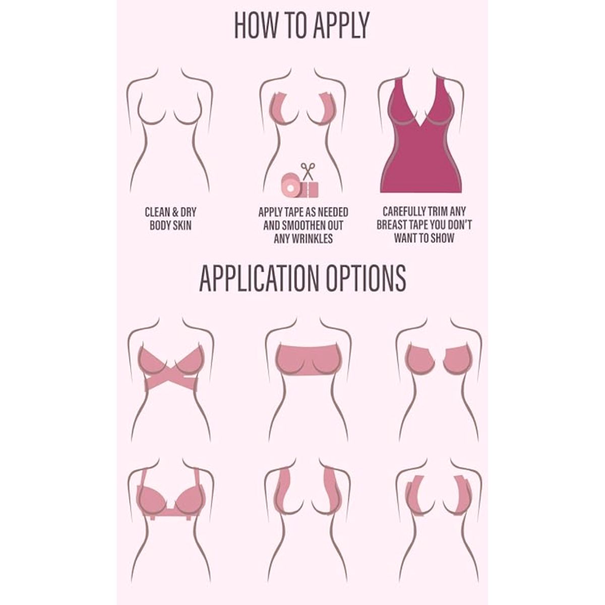 Breast Tape Lift Kit Includes - One roll of boobtape, two silicone nipple protection pasties, six satin boob petals