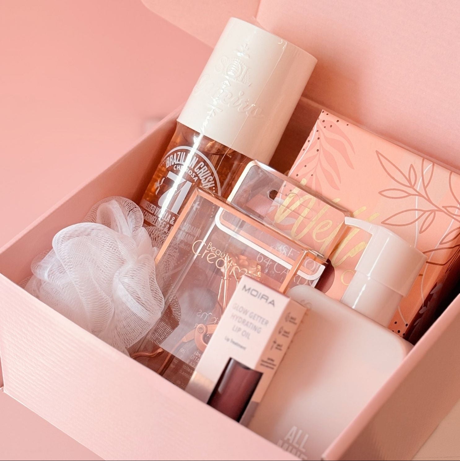 Gift Box + Wellness Cards Set + BC Rose Gold Eyelash Curler + Beauty Creations Assorted Body Lotion + SACH Classic Body Bar + Cheirosa 71 Hair & Body Mist + Body Loofah + Moira Glow Getter Hydrating Lip Oil + Mom Dried Flowers Fridge Magnet